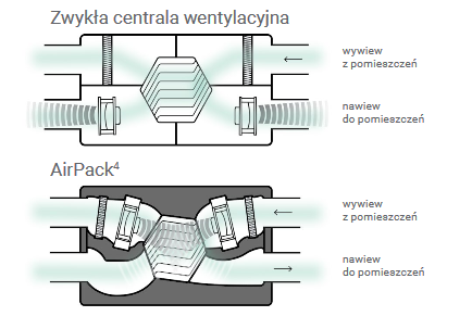 W systemie wentylacji najbardziej uciążliwy jest hałas emitowany do kanału nawiewnego, ponieważ doprowadza on powietrze do sypialni i salonu. To właśniez tym hałasem AirPack4 radzi sobie doskonale. AirPack4 redukuje hałas dzięki koncepcji układu przepływowego oraz konstrukcji obudowy. Koncepcja układu przepływowego, w której wentylator nawiewny został zlokalizowany przed wymiennikiem ciepła pozwala na wykorzystanie kilku tysięcy kanalików wymiennika ciepła do rozpraszania energii akustycznej generowanej przez wirnik wentylatora. Dodatkowa redukcja hałasu została uzyskana dzięki specjalnie ukształtowanej obudowie ze spienionego polipropylenu, która ogranicza turbulencję i absorbuje część energii akustycznej.