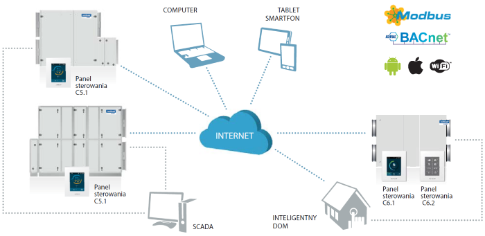 | Sterowanie za pomocą przeglądarki internetowej | Jeśli jednostkę podłączono do sieci wewnętrznej lub Internetu, możliwe jest sterowanie parametrami urządzenia za pomocą prostego interfejsu w przeglądarce internetowej na komputerze, lub za pomocą innego urządzenia mobilnego |