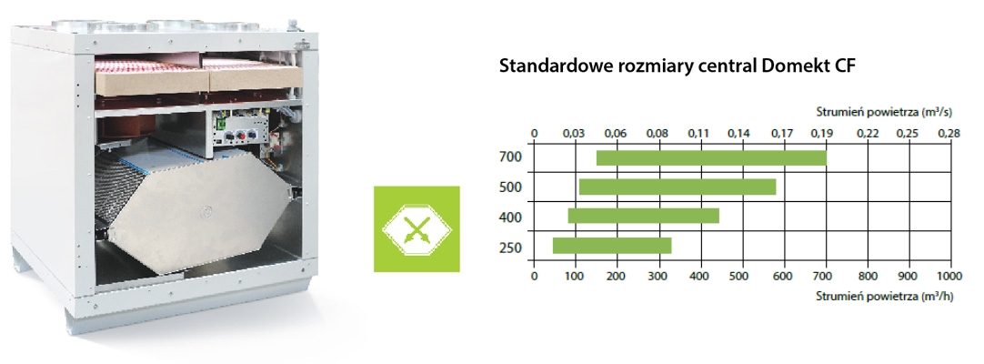 | Free cooling | Gdy temperatura w pomieszczeniu jest wyższa od nastawionej, a temperatura zewnętrzna jest niższa, wówczas wymiennik ciepła przestaje pracować, a pomieszczenia schładzane są powietrzem zewnętrznym |